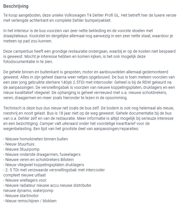A very beautiful VW Bus Camper. Everything is in new condition and the (new) 2.5 TDi engine has only run 30,000 km. Equipped with a 5-speed manual gearbox. The interior is like new and perfect. A lot has also been mechanically renewed. See the full description in the photos. Camper is ready for your holiday! Biggest choice in REAL Classic Cars in the Stolze Collection with more than 450 cars in stock ! From a project to perfect.