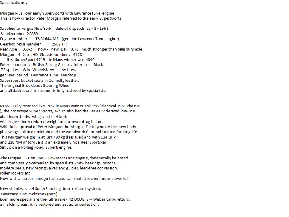 A VERY nice, VERY rare Morgan Plus Four. Was made in 1961. With the original Lawrence Tune 4 cil. 134 HP Triumph engine! Original all aluminium lowered body. This unique classic Morgan is totally 100% restored. Concours winner in Holland: DNTD 2016.
