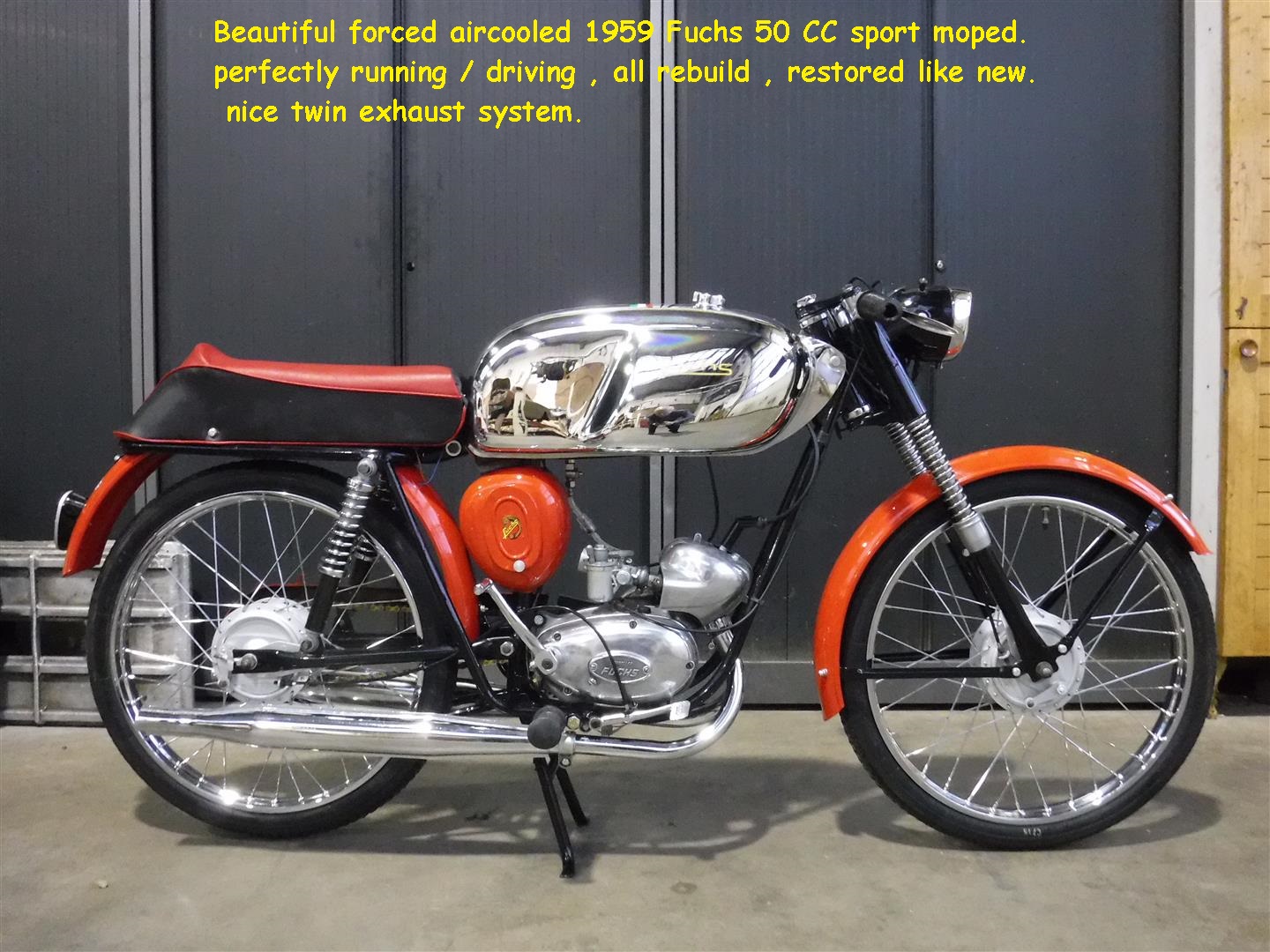 Beautiful forced aircooled 1959 Fuchs 50cc Sport moped. Perfectly running / driving, all rebuild, restored like new. With nice twin exhaust systeem. Biggest choice in REAL Classic Cars in "the Stolze Collection" with more than 450 cars in stock ! From a project to perfect .