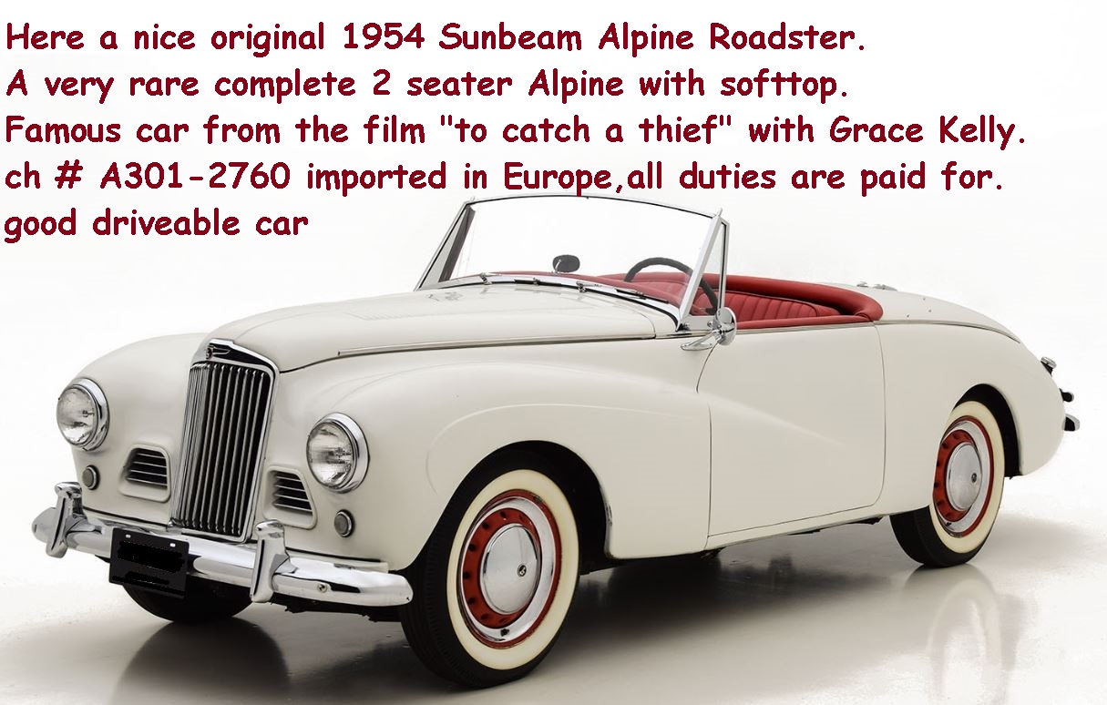 Here a nice 1954 Sunbeam Alpine Roadster. A very rare complete 2 seater Alpine with softtop. Manual transmission. Famous car from the film 'to catch a thief' with Grace Kelly. Imported into the EU, all duties paid for. Biggest choice in REAL Classic Cars in "the Stolze Collection" with more than 450 cars in stock ! From a project to perfect .