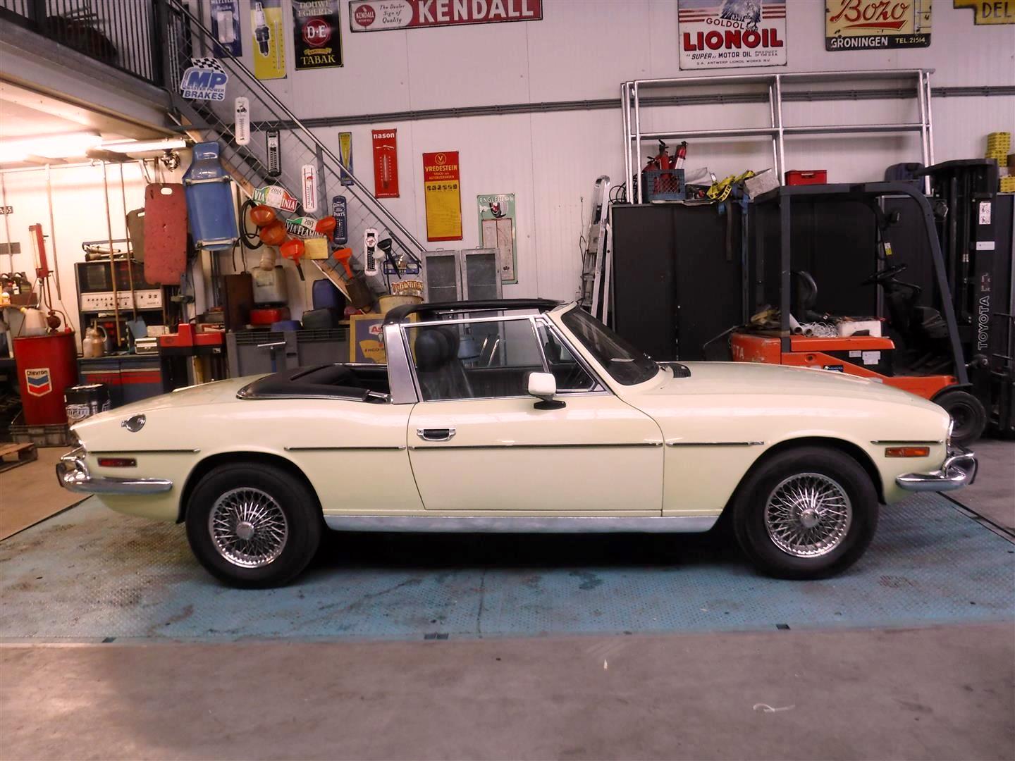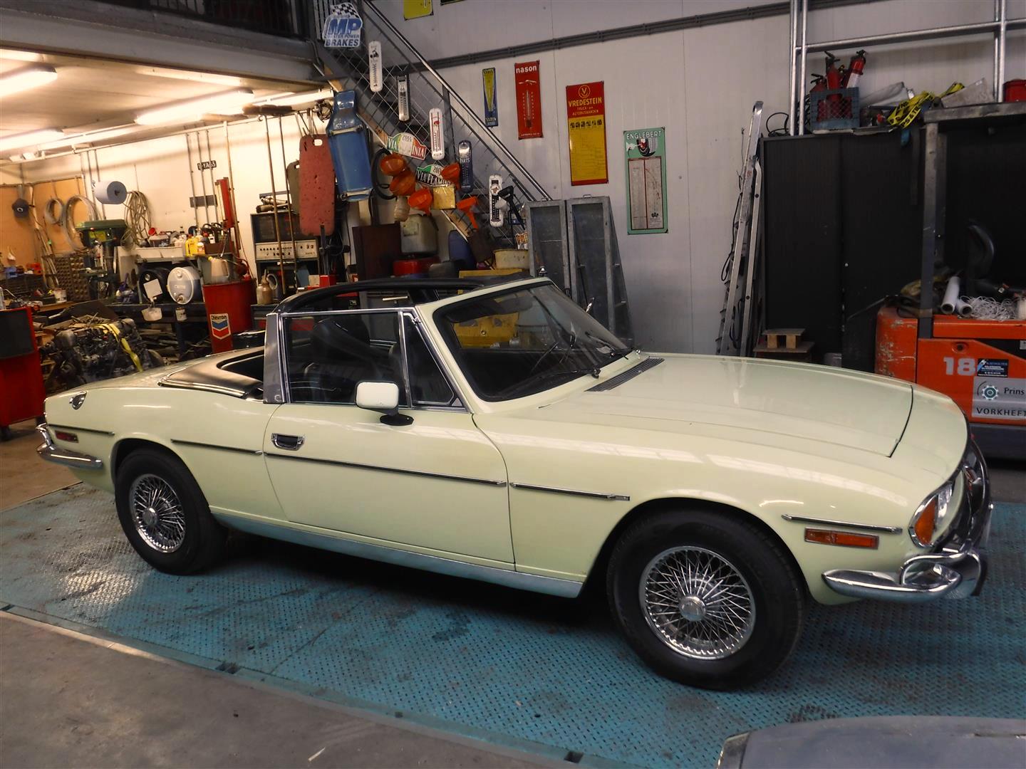 This is a 1972 Triumph Stag. With the original V8, 3.0 ltr. motor and automatic gearbox. Equipped with a convertible top in used condition. The car has a very cool body, beautiful paint and perfect original floors. This car still has the original interior. The Triumph has NO rust or damage. In short: Just a VERY cool, completely original, well-running Stag. But dashbord and softtop need to be renewed to make perfect . Biggest choice in REAL Classic Cars in "the Stolze Collection" with more than 450 cars in stock ! From a project to perfect .