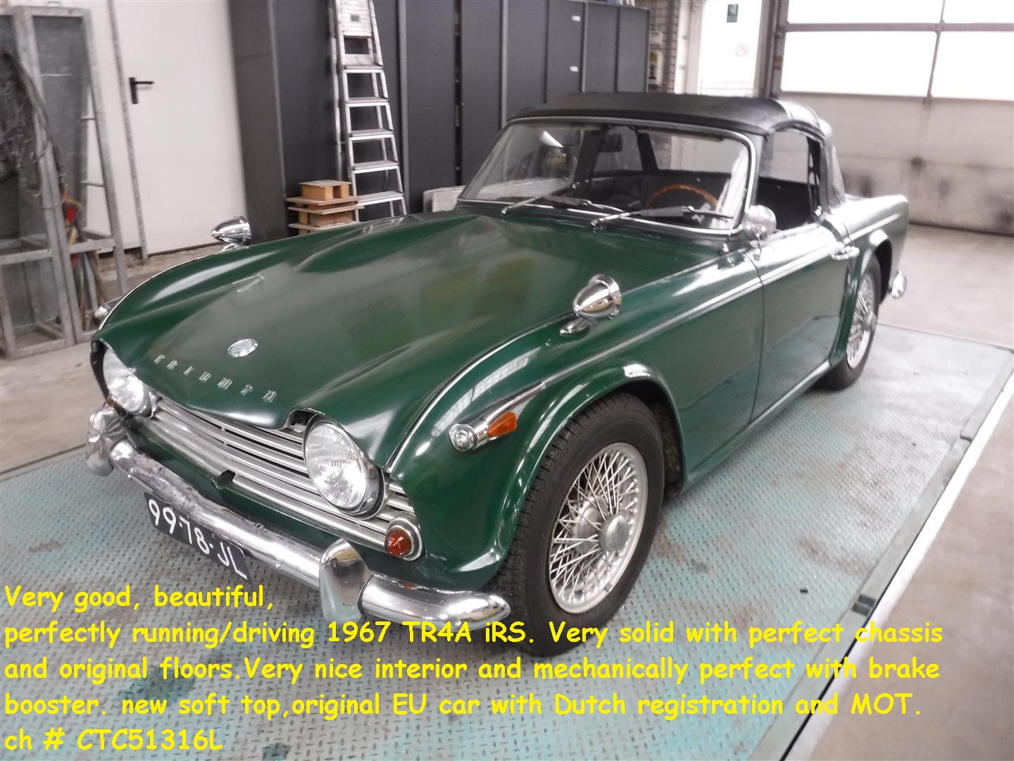 Very good, beautiful, perfectly running 1967 TR4A iRS. Very solid with good chassis and original floors. Nice interior and mechanically perfect with brake booster. New softtop, original EU car with Dutch registration and MOT. Vin number# CTC51316L Biggest choice in REAL Classic Cars in "the Stolze Collection" with more than 450 cars in stock ! From a project to perfect .
