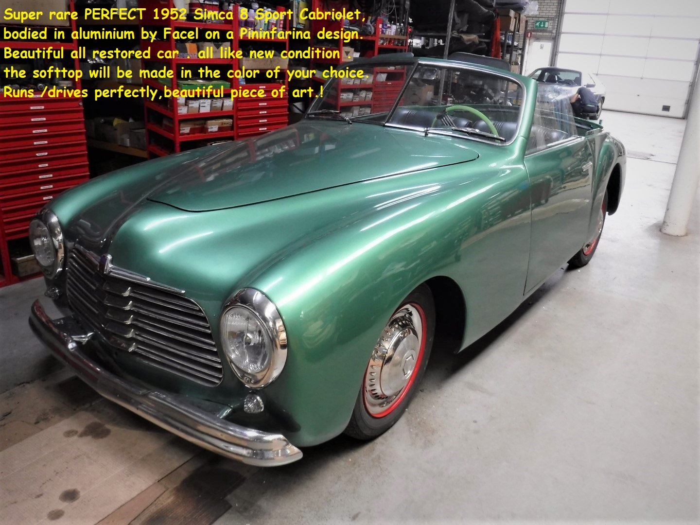 Super rare beautiful 1951 Simca 8 Sport Cabriolet, bodied in aluminium by Facel on a Pininfarina design. Beautiful all restored car. All like new condition. The softtop will be made in the color of your choice. Runs /drives perfectly, beautiful piece of art. Biggest choice in REAL Classic Cars in "the Stolze Collection" with more than 450 cars in stock ! From a project to perfect .
