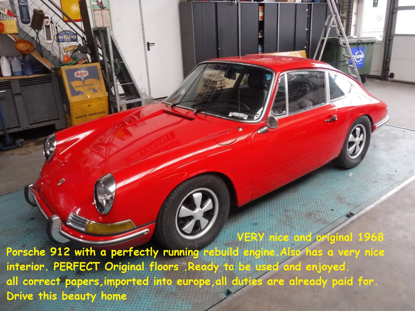 VERY nice and original 1968 Porsche 912 with perfectly running rebuild engine. Also, with a very nice interior. PERFECT original floors. Ready to be used and enjoyed. All correct papers, imported into europe, all duties are already paid for. Drive this beauty home ! Biggest choice in REAL Classic Cars in "the Stolze Collection" with more than 450 cars in stock ! From a project to perfect.