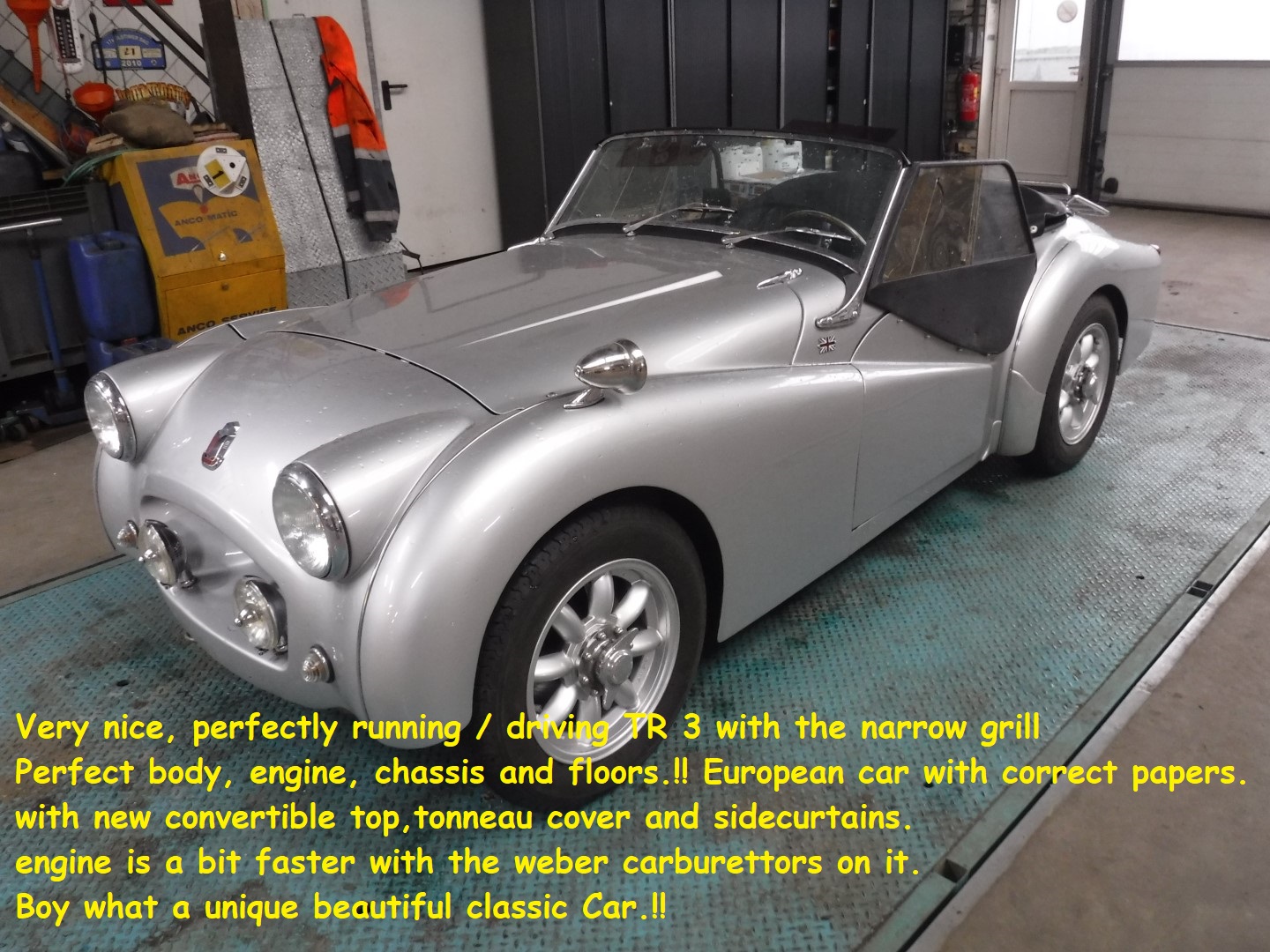 Very nice, good running and driving TR 3 with the small grill. Body, engine, chassis and floors in good condition. European car with correct papers. Comes with a new convertible top, tonneau cover and sidecurtains. Engine is a bit faster with the weber carburettors on it. What a unique classic car. Biggest choice in REAL Classic Cars in the Stolze Collection with more than 450 cars in stock ! From a project to perfect.